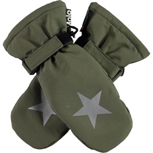 Waterproof, breathable mittens with 3M™ Thinsulate™ insulation. They are in green and have star reflectors on top of the hand. They have elastic and adjustable velcro at the wrists. The outer fabric is 51% recycled and made of recycled polyester. The mittens have a water resistant, PFC-free surface treatment (Does not contain, e.g. PFOS, PFOA, etc). Water coloumn pressure: 10.000 mm and breathable: 8.000 g/m2/24hr.