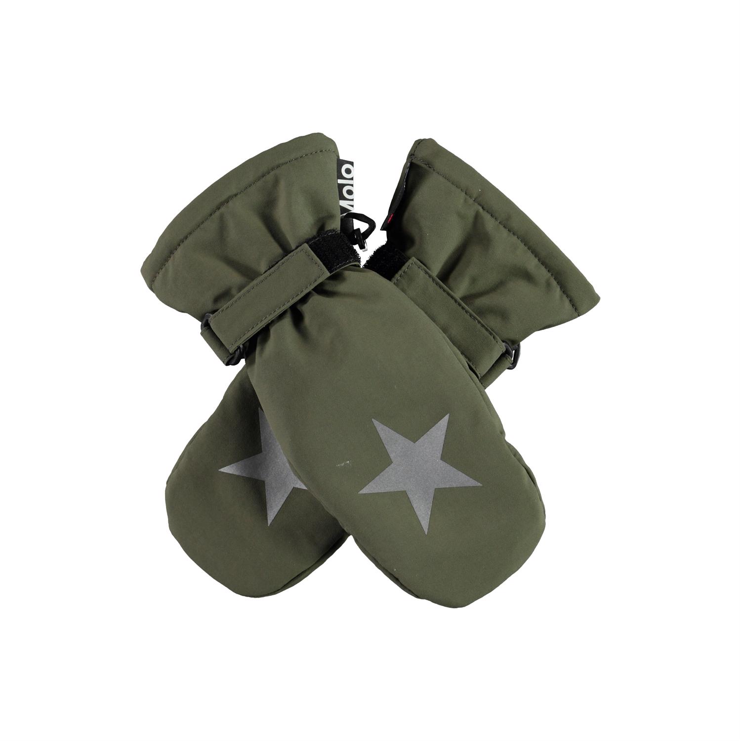Waterproof, breathable mittens with 3M™ Thinsulate™ insulation. They are in green and have star reflectors on top of the hand. They have elastic and adjustable velcro at the wrists. The outer fabric is 51% recycled and made of recycled polyester. The mittens have a water resistant, PFC-free surface treatment (Does not contain, e.g. PFOS, PFOA, etc). Water coloumn pressure: 10.000 mm and breathable: 8.000 g/m2/24hr.