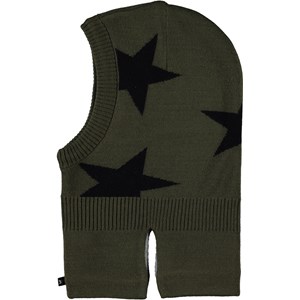 Green balaclava with intarsia stars. The hat is in a soft wool blend and is lined in fleece. It has slits on the sides of the neck so it fits well over the shoulders and chest.