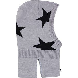 Grey balaclava with black intarsia stars. The balaclava has slits on the side of the neck so it fits well over the chest and shoulders. Made in a soft wool blend and lined with soft fleece lining.