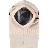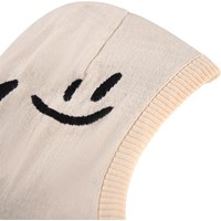Cream-coloured balaclava with black smiling faces. The balaclava has slits on the side of the neck so it fits well over the chest and shoulders. Made in a soft wool blend and lined with soft fleece lining.