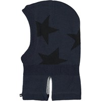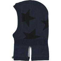 Blue ski mask in a soft wool blend with intarsia stars, a soft fleece lining and slits at the neck so it sits better over the shoulders and chest.