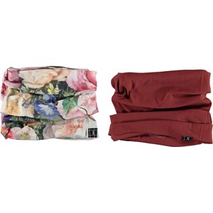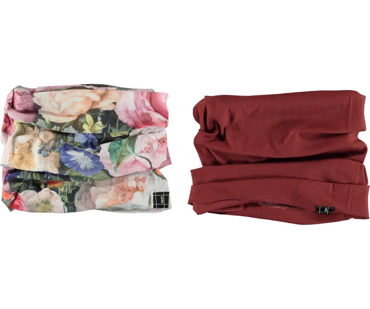 2 gaitors that can be used year round and in many different ways. One is in a floral print, while the other is red. Use the gaitors around the neck or pull them up over the ears.