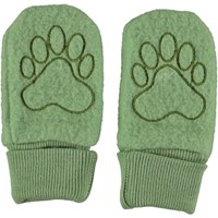 Green baby mittens in soft fleece made from 100% merino wool. The mittens have snug ribbed cuffs with folded edges at the wrists and a cute embroidered paw motif in the palm.