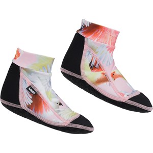 Neoprene swim socks that protect small feet from sharp objects and hot sand. They are constructed in the 'Cockatoos' print .
