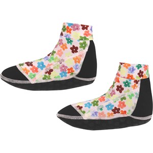 Black aqua socks with a pink floral print. They protect small feet against sharp objects and warm sand. The socks are constructed in recycled, stretchy polyester, which makes them easy to slip on and off. Molo's swimwear has a high level, 50+ UV protection.