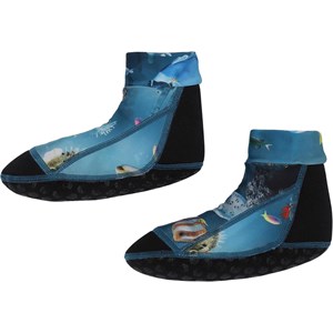 Neoprene aqua socks that protect small feet against sharp objects and hot sand. These socks have a print of fish and coral on a blue sea background with black soles.