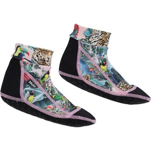 Neoprene swim socks that protect small feet from sharp objects and hot sand. They are constructed in the 'Wild Amazon' print.