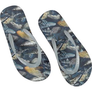 Must-have flip flops to wear all summer long. They have dark toe straps. The flip flops are in a unique shark print.