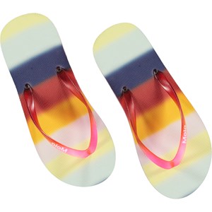 Must-have flip flops to wear all summer long. They have dark toe straps. The flip flops are in a soft rainbow print.