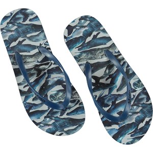 Flip-flops you can't live without. The bottom of the sandal has a whale print and matching blue straps.