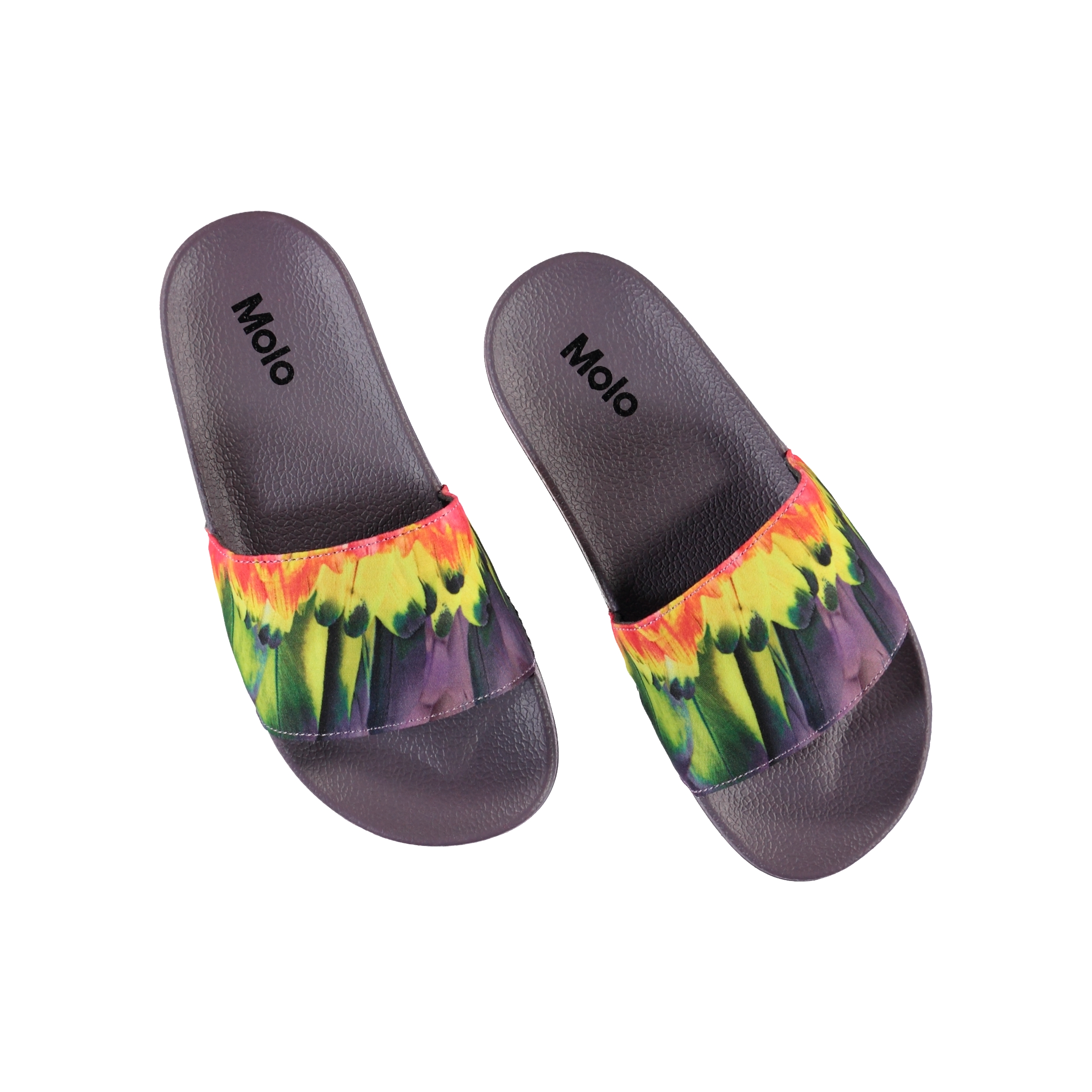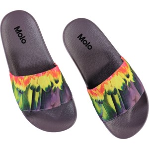Molo's Zhappy sandals are a must to keep your toes cool in the summer heat. These slippers are purple and have a parrot feather print.