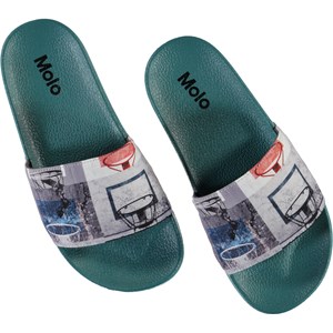 Molo's Zhappy sandals are a must for cool toes in the summer heat. These slippers are in blue with a basketball print.