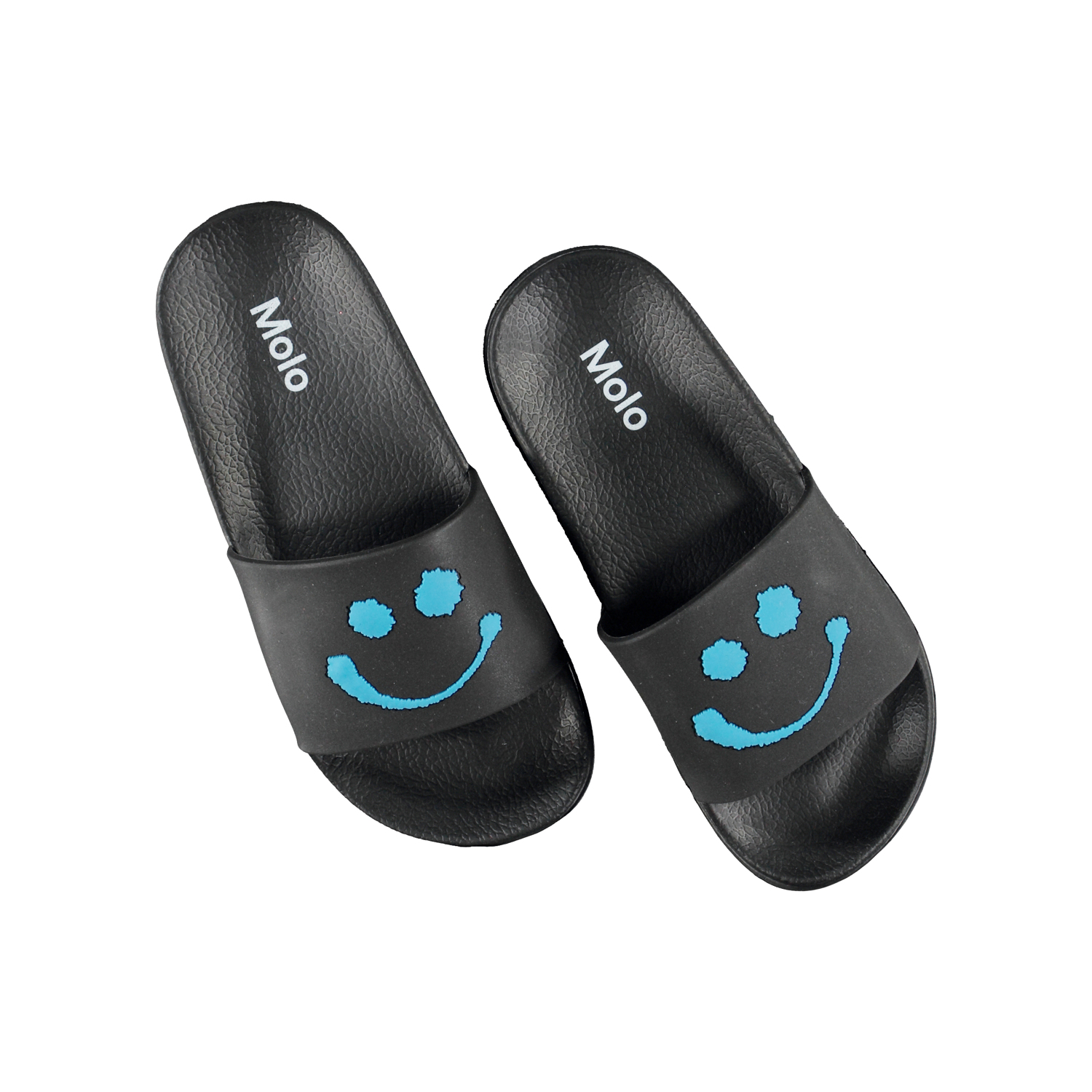 Black swim sandals with happy, blue smiling faces on the front. The sandals are waterproof, so they are perfect to bring to the pool or to the beach.