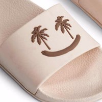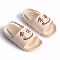 Sand-coloured sandals with a wide foot strap and moulded insole. The sandals are water-resistant, making them perfect for the pool or beach. The foot strap has a smiling face with palm tree eyes. Sizes 23/24 and 25/26 feature a convenient elastic heel strap for a secure, comfortable fit.