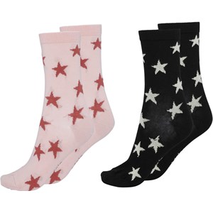Two pairs of socks. One pair is rose coloured and the other is in black with an intarsia stars.