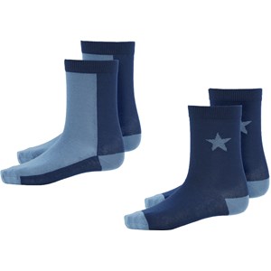 Two pair socks. One pair is light blue and dark blue. The other pair is dark blue with light blue toes and heels and stars at the ankles.