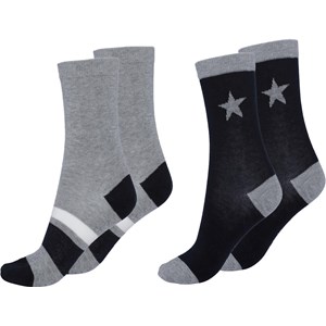Two pairs of socks in blue and grey. One pair has an intarsia star and the other pair is in stripes.