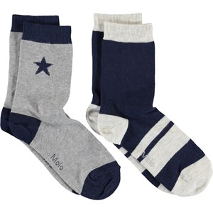 Two pairs of socks in grey and blue. One pair is grey with intarsia stars, and the other pair is in blue with white stripes.