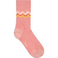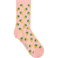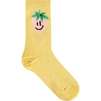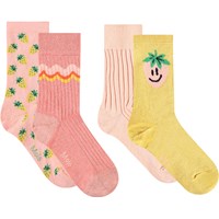 4-pack of cotton ribbed socks with ribbed cuff for better fit. The pack includes a pair of pink socks with a ribbed pattern, a pair of yellow socks with glitter and a smiling strawberry, a pair of pink socks with yellow strawberries, and a pair of pink socks with glitter and pretty wavy ribbons.