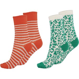 Two pairs of socks. One pair is in a green and white leopard print, and the other pair is in red with narrow white stripes.