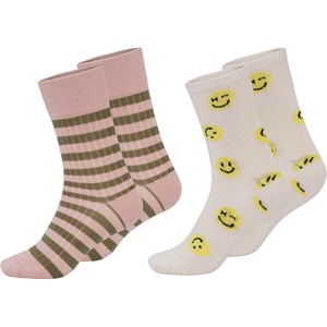 Two pair ankle socks. One pair is in a rose colour with light green stripes in rib, and the other is cream coloured with yellow smiley faces.