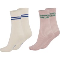 Two pairs of socks. One pair is in rose with the text 'One world one love', and the other is white with narrow blue stripes.