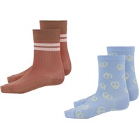 Two pair socks. One pair is in rib and is bordeaux with two pink stripes at the ankle. The other pair is light blue with yellow peace sign hearts.