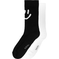 2-pack of socks in organic cotton. The socks have rib at the leg and elastic at the top. They are wonderfully soft to wear. The pack includes a pair of light pink socks with a smiling glitch face and a pair of off-white socks with a green Yin Yang design.