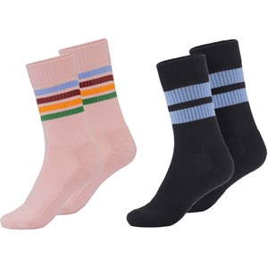 Two pair sporty socks in rib. One pair is in pink with thin rainbow stripes. The other pair is in black with two wide stripes in light blue.