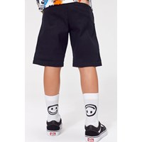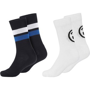 Two pair sporty socks in rib. One pair socks is in black with two wide stripes in white and black. The other pair is white with black/white smiley faces.