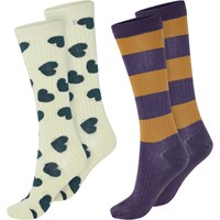 Two pair long socks. One pair is in light yellow with green hearts, and the other is in purple with gold coloured stripes.
