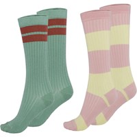 Two pairs of long socks. One pair is in wide, green and red stripes. The other is pink with wide, yellow stripes.