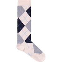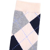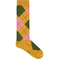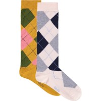 2-pack long cotton socks. The socks are knee-length and have a ribbed cuff at the top to ensure they stay in place. The pack includes a pair of checked socks in yellow, pink, and green, as well as a pair of checked socks in off-white, grey, and black.