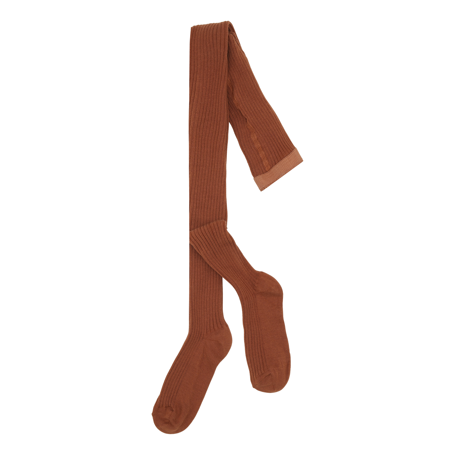 A pair of red/brown tights in rib, with a wide elastic at the waist for a perfect fit.