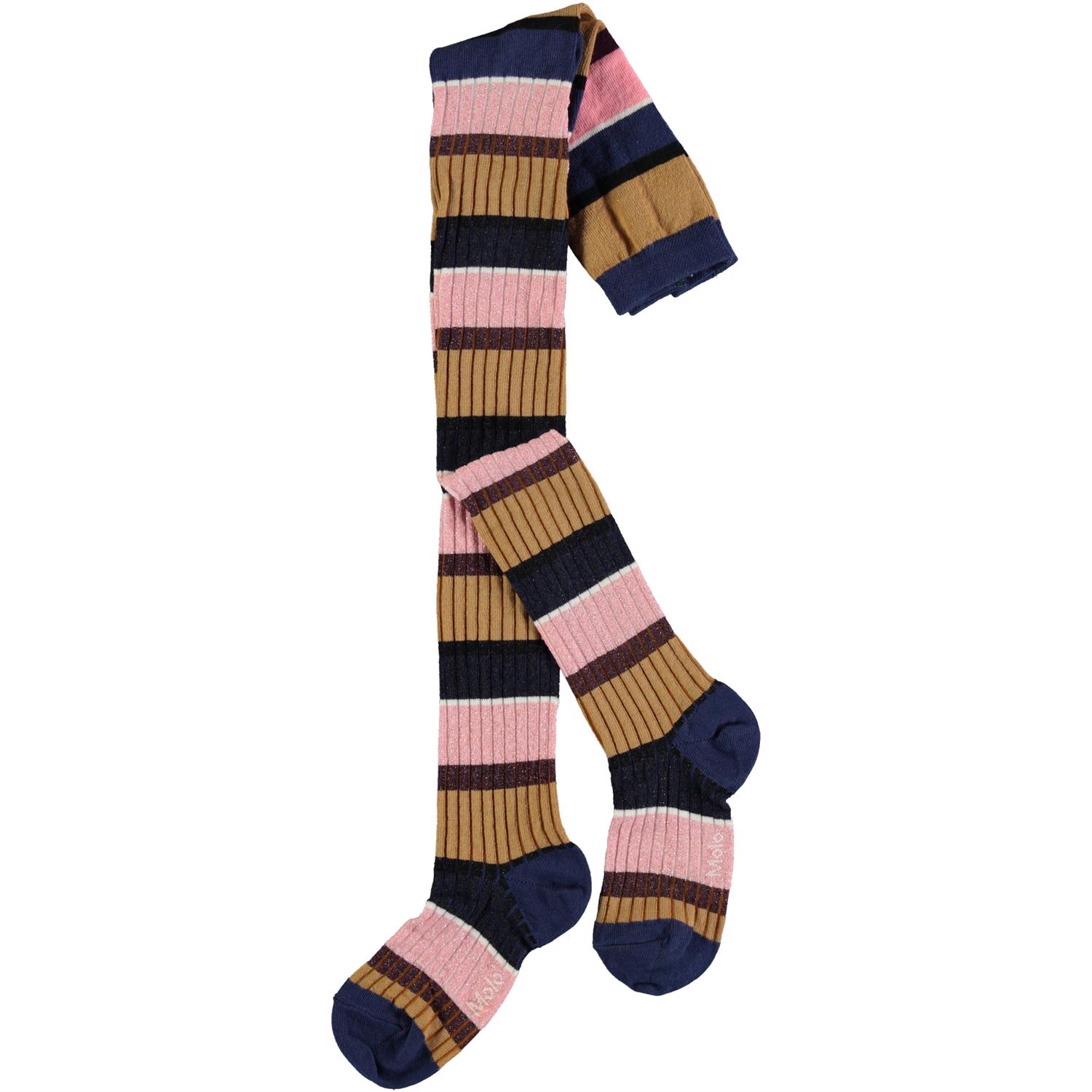 Tights with wide stripes in rose, gold and blue. They are in rib with glitter.