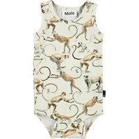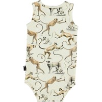 Faros is a sleeveless, white baby bodysuit with a print of monkeys that are holding each other's tails. Faros has an easy snap closure between the legs for quick changes.