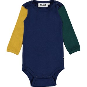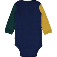 Fair is a long sleeve baby bodysuit in ribbed colour-blocking. The bodysuit is blue with one yellow and one green sleeve. It has easy snap closure at the neck and at the crotch.