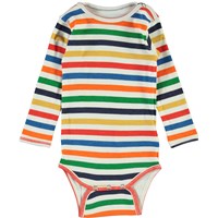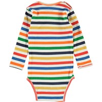 Fair is a multi-striped baby bodysuit with long sleeves. It has an easy snap closure at the neck and crotch.