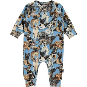 Fairfax is a baby bodysuit with long sleeves and legs with a print of adorable puppies. It has raglan sleeves and an easy snap closure that is slanted at the neck and a snap closure between the legs for quick changes.