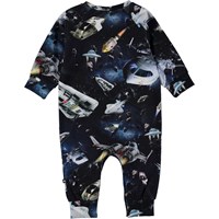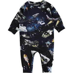 Take a trip into space in Molo's new "Space Traffic" print on the Fairfax baby romper with long sleeves and legs. It has an easy snap closure at the neck and crotch.
