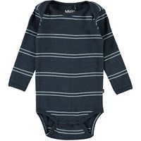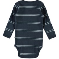 Faros is a blue baby bodysuit with stripes and long sleeves. Faros has an easy snap closure at the collar and at the crotch.