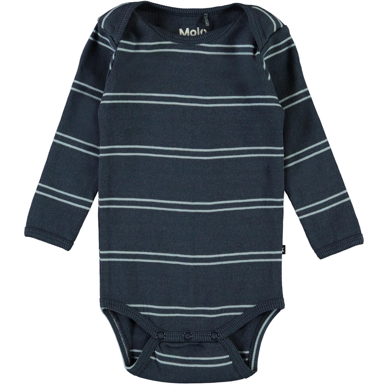 Faros is a blue baby bodysuit with stripes and long sleeves. Faros has an easy snap closure at the collar and at the crotch.