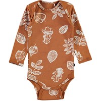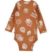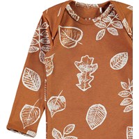 Faros is a brown baby bodysuit with white leaf drawings. Faros has easy snap closure at the collar and at the crotch.