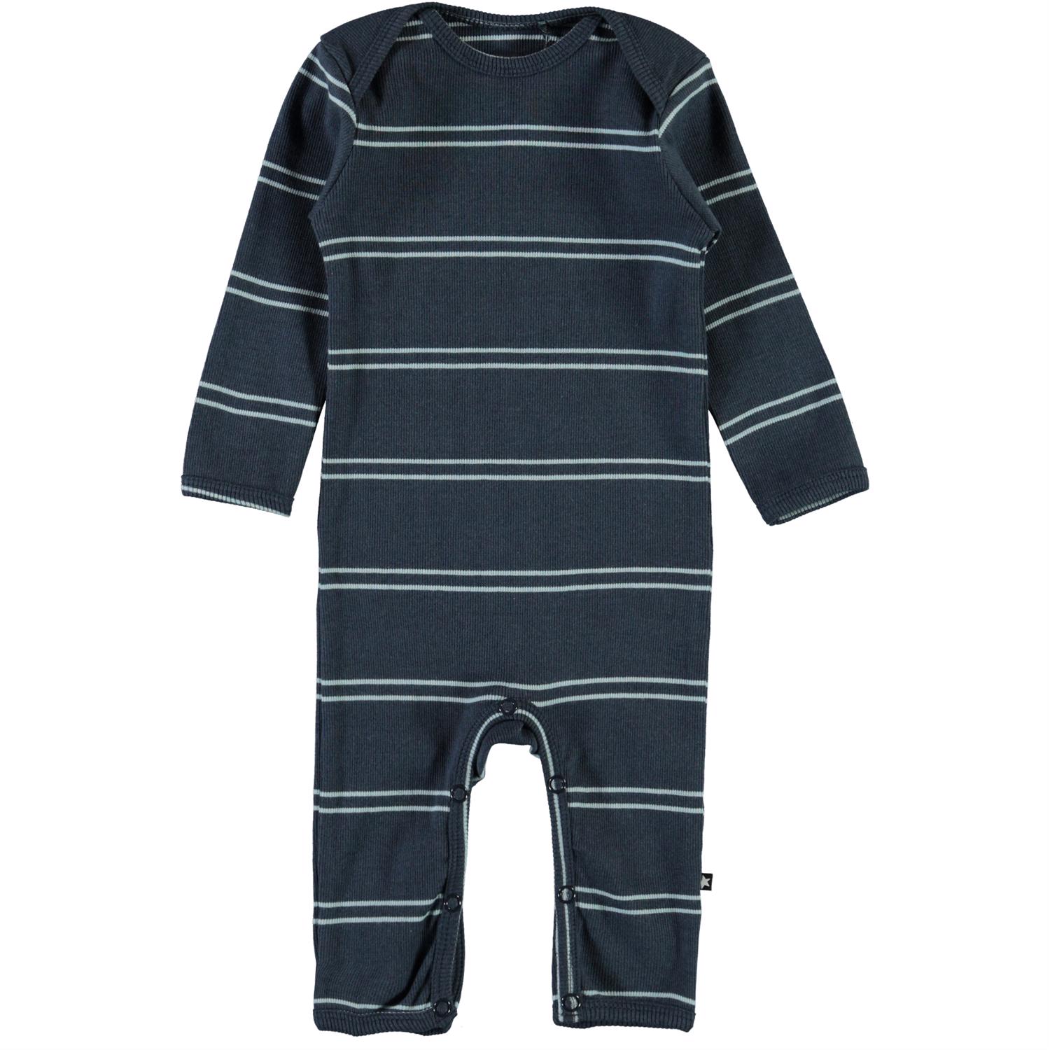Faso is a blue striped baby bodysuit in rib, with long sleeves and long legs. It has easy snap closure at the neck and crotch.