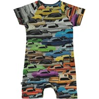 Felton is a baby bodysuit with an all-over print of colourful cars. The bodysuit has short sleeves and legs. It has an easy snap closure at the neck and crotch.