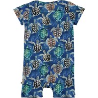 Felton is a blue baby bodysuit with a turtle print. It has short sleeves and legs. The bodysuit has easy snap closure at the neck and crotch.