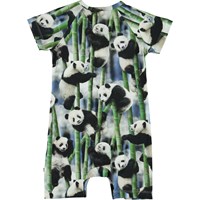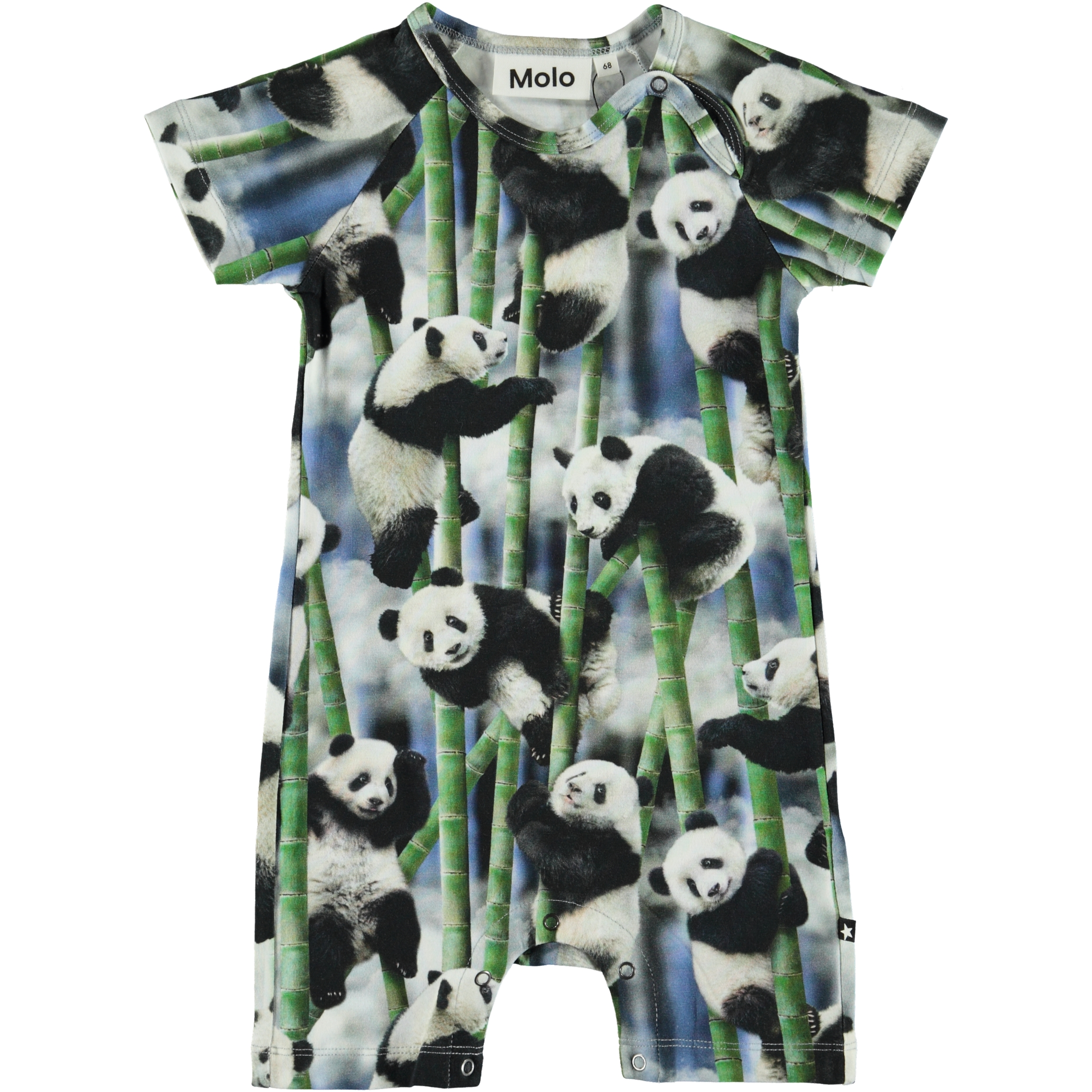Felton is a baby bodysuit with an all-over print of panda bears and their favourite food: bamboo. The bodysuit has short sleeves and legs. It has an easy snap closure at the neck and crotch.