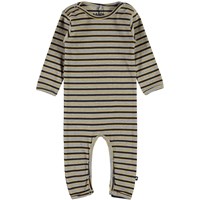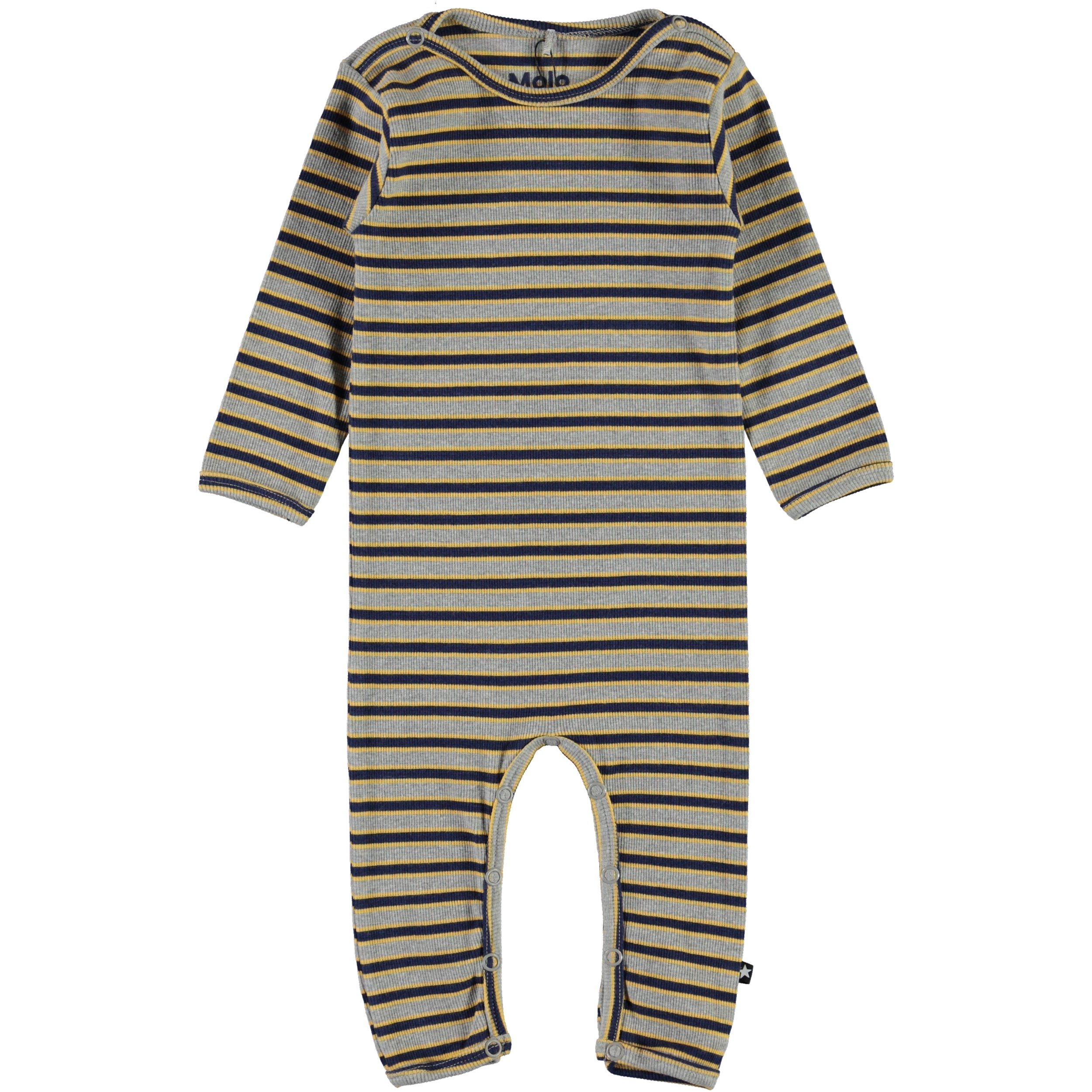 Fenez is a striped rib baby bodysuit in grey, blue ad yellow. It has easy snap closure at the neck and crotch.