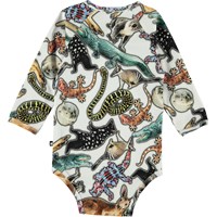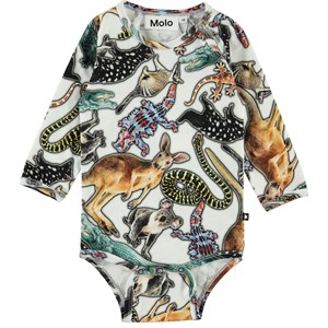 Field is a long sleeve baby bodysuit with an all-over print of Australia's wild animals. It has an easy snap closure at the neck and crotch.